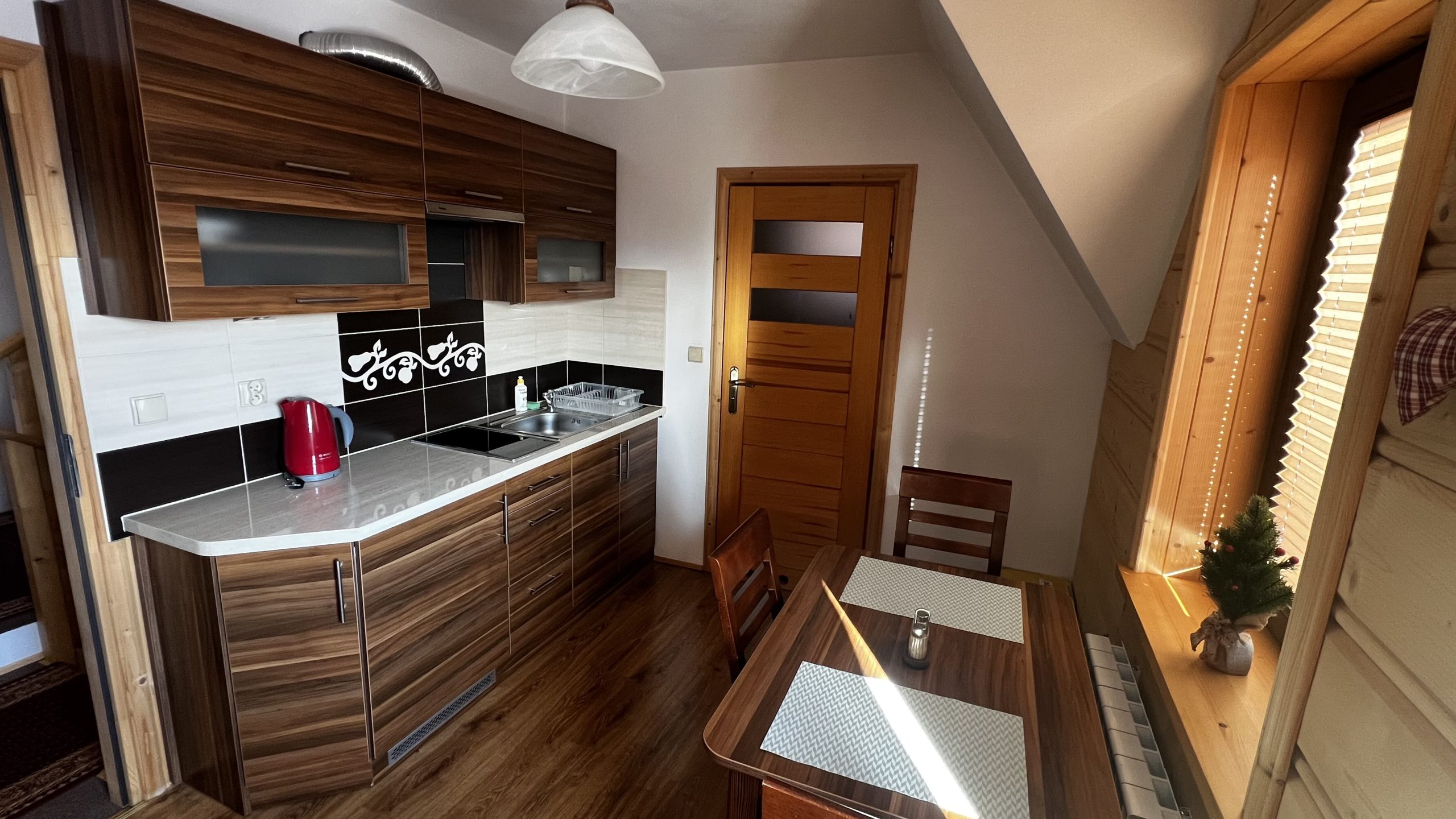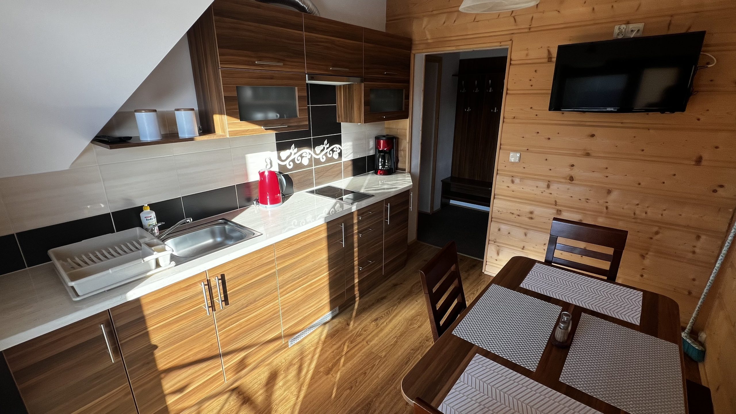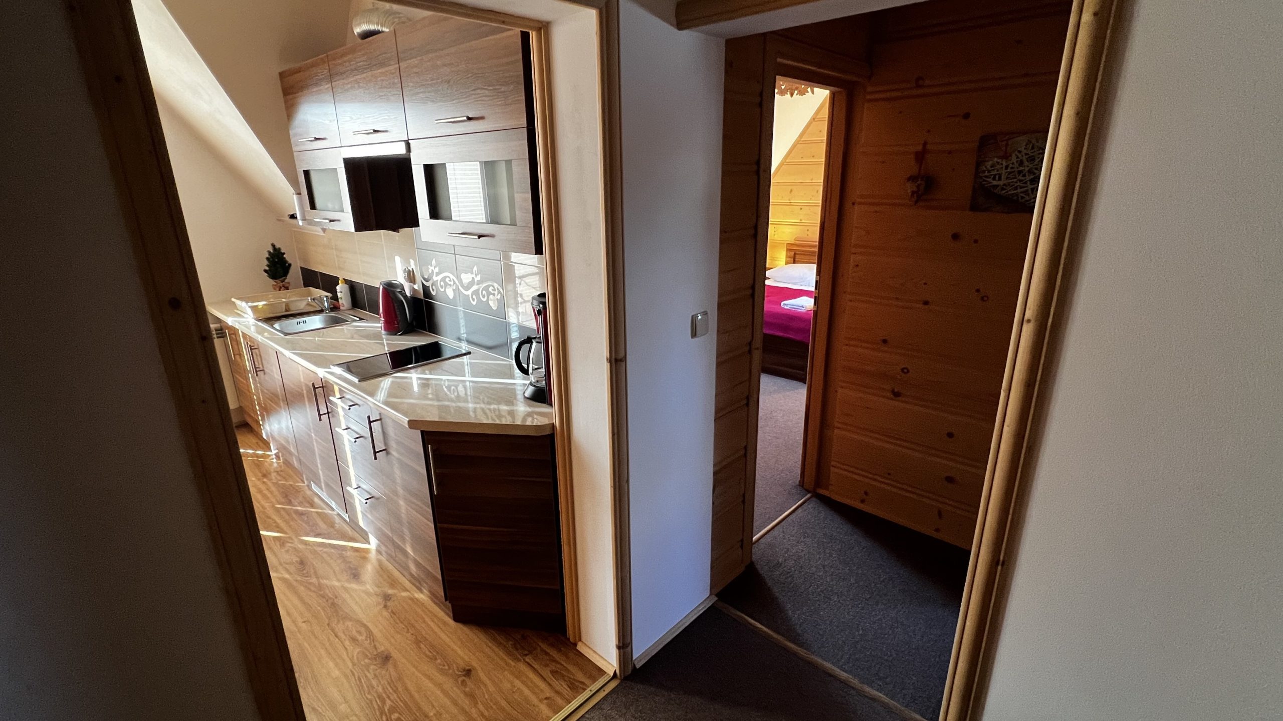 Aneks kuchenny z lodówką,czajnikiem, płytą ceramiczną oraz pełnym wyposażeniem.